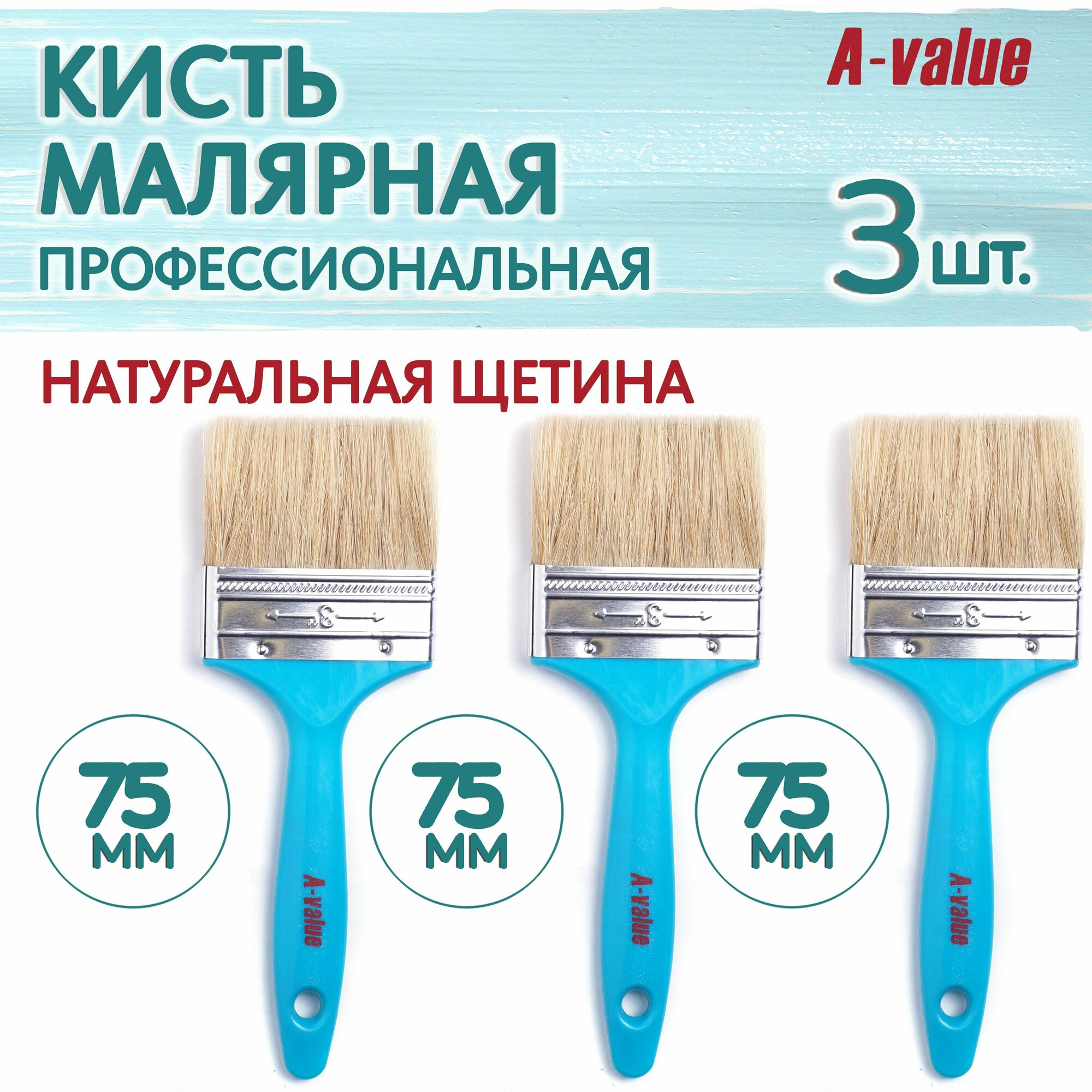 10 цен на Кисть малярная плоская 75 мм, набор 3 шт, из натуральной щетины, пластиковая ручка