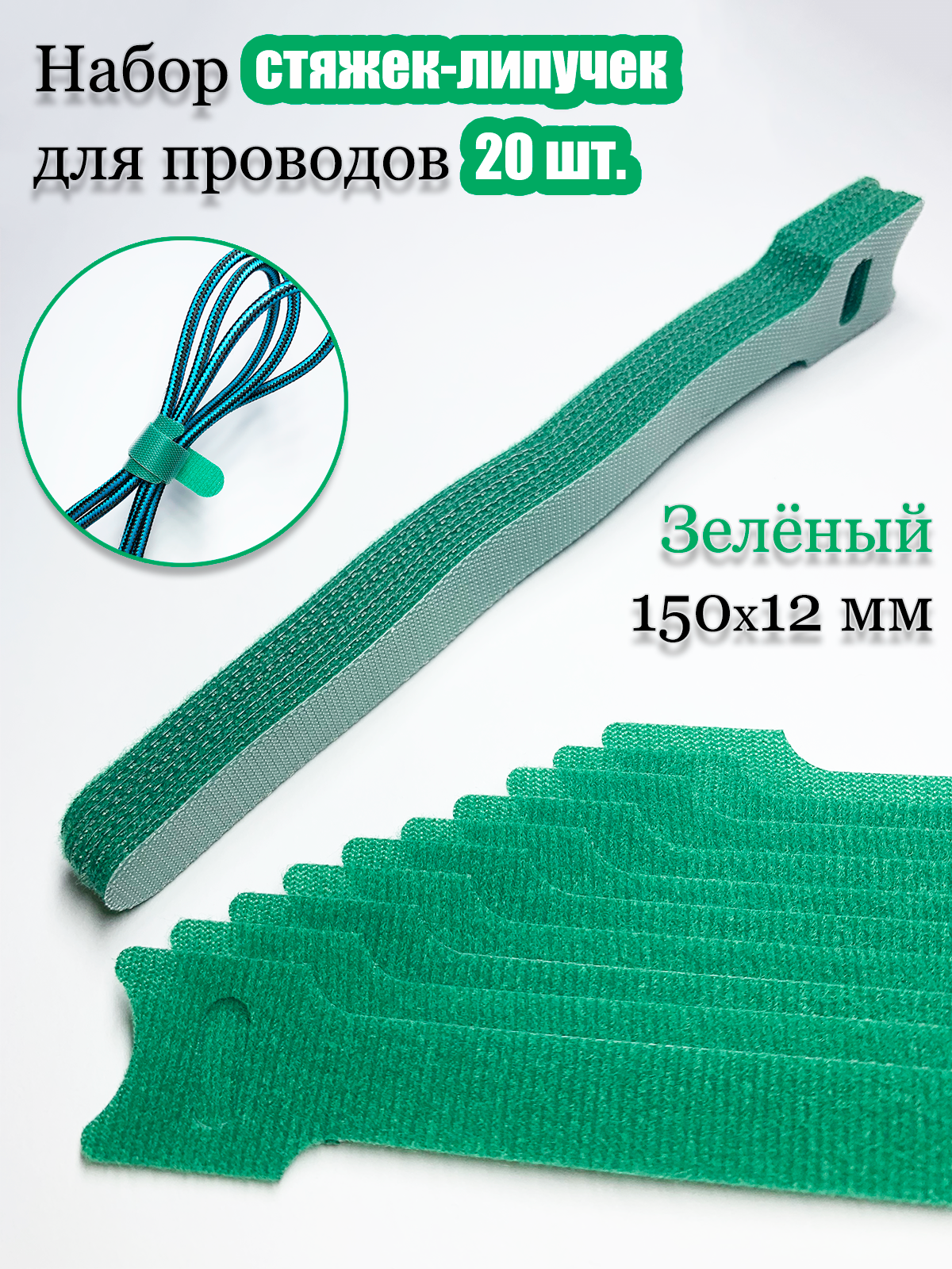 10 цен на Многоразовая стяжка-липучка для проводов и кабелей 150х12 мм. Цвет зеленый. 20 шт.