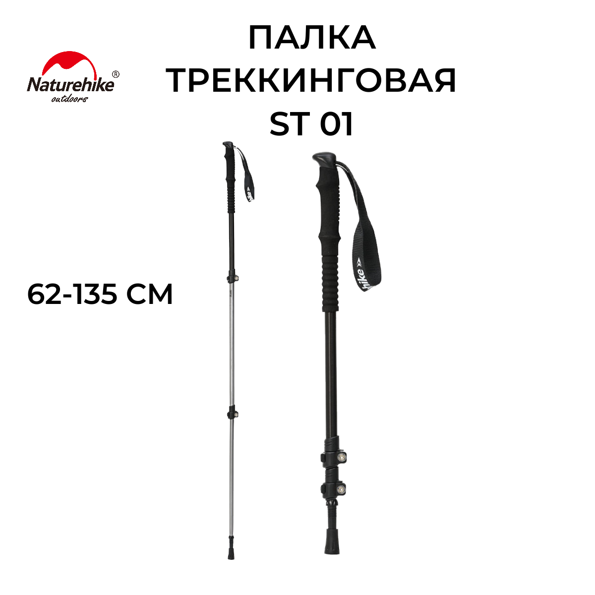 Naturehike Палка Треккинговая ST01 6061 AL NH17D001-Z с 3 узлами мужские 62-135 черный, 6927595720400