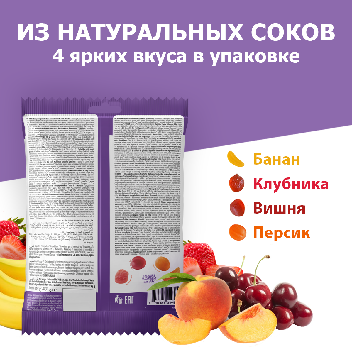 | Состав | Рисовый сироп*, тростниковый сахар*, желирующий агент (пектин), лимонная кислота, натуральные ароматизаторы (банан, персик, вишня, клубника), концентрированные соки моркови*, яблока*, тыквы* и черной смородины*, подсолнечное масло*, глазирователь (карнаубский воск*), крахмал*. * - сертифицированные органические ингредиенты. |