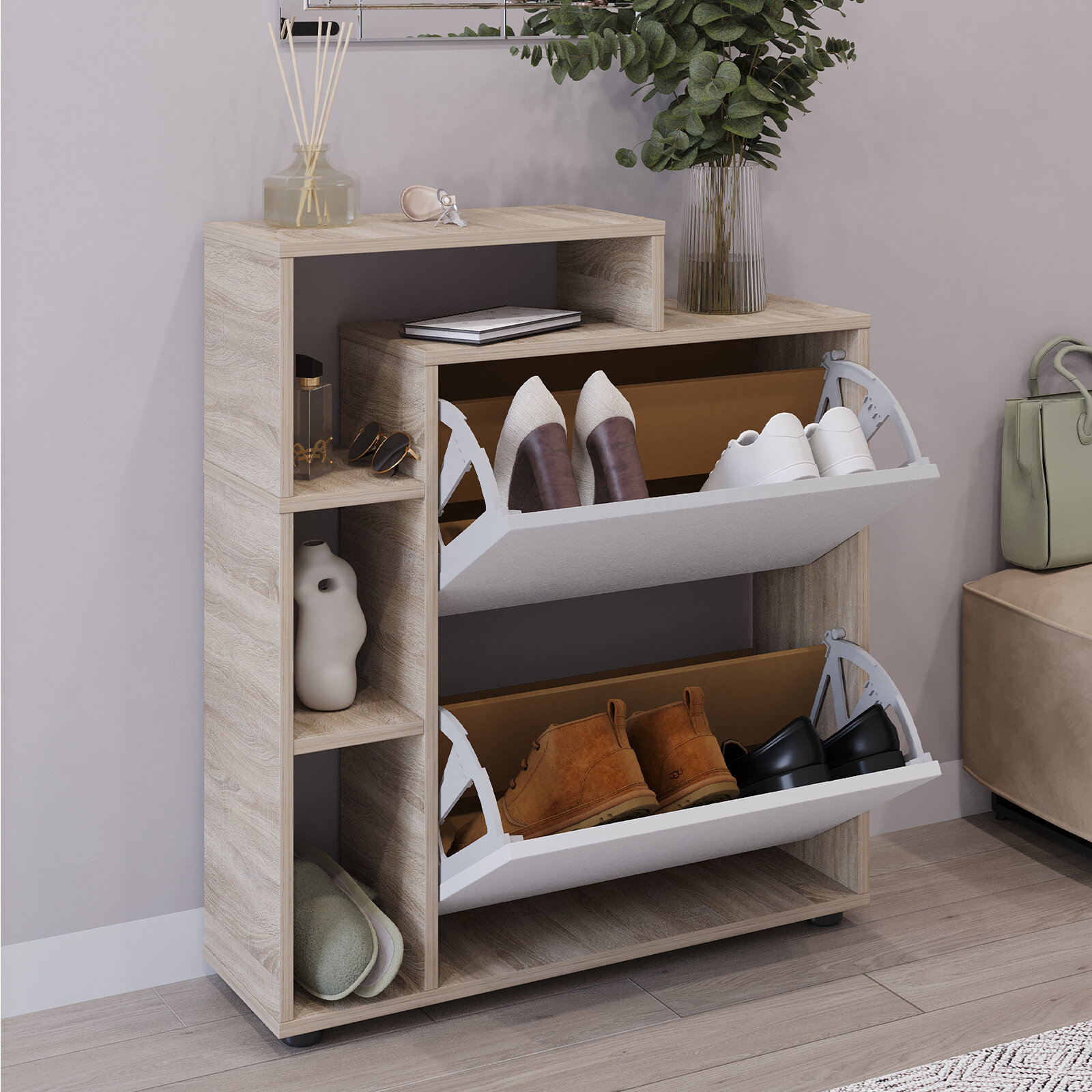 10 цен на Обувница Ultra Plus вертикальная 2 секции Дуб сонома/Белое тисн. 750х859х246