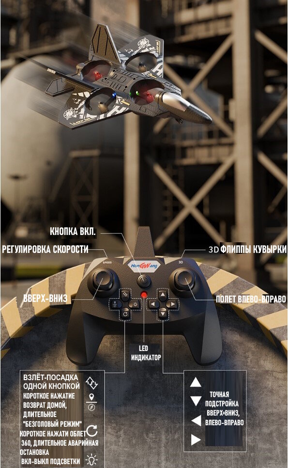 Отзывы на Самолет на радиоуправлении Истребитель F22 четырехвинтовой Дрон Квадрокоптер с гироскопом/Ударопрочный EPP-материал/На пульте управления/2аккумулятора
