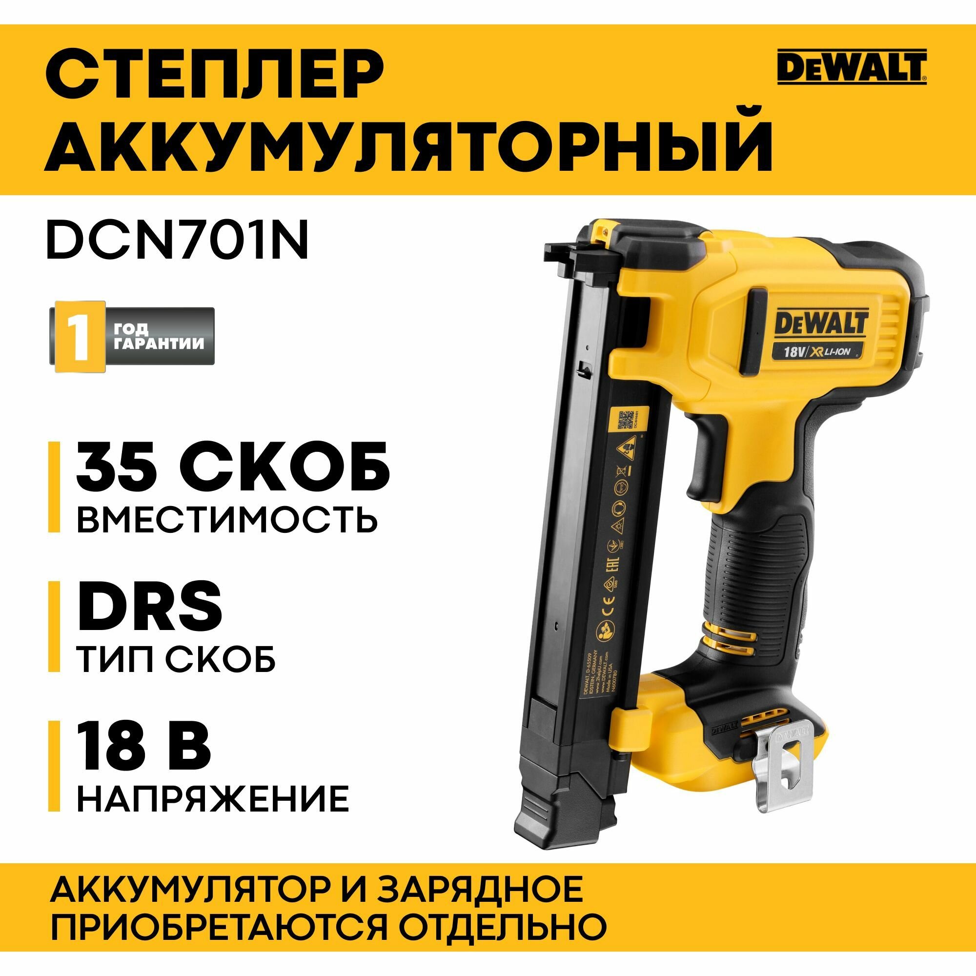 Степлер аккумуляторный 18В DCN701N DeWALT DCN701N-XJ информация: