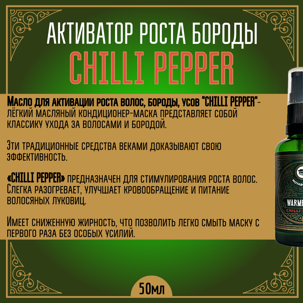 Активатор для роста волос, бороды, усов MOYABORODA "CHILLI PEPPER", прешейв для бритья (органик масло с Чилийским перцем). (50мл.) информация: