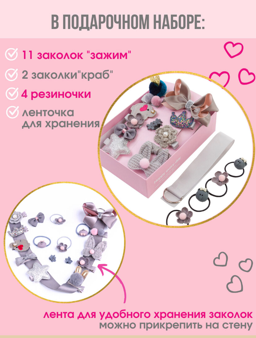 Подарочный набор заколок и резинок для девочек/ 18 предметов / Заколки детские / аксессуары для волос / серый информация: