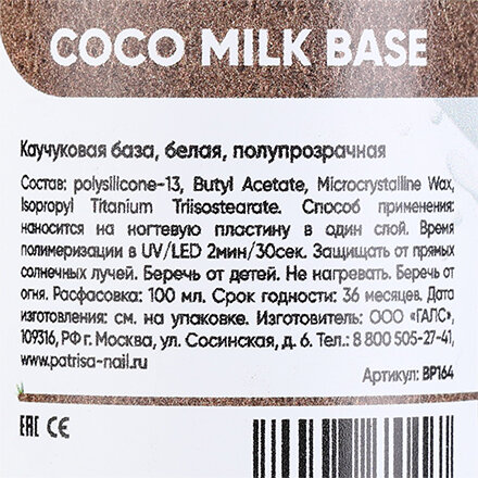 Каучуковая молочная база для ногтей Coco Milk Base, камуфлирующая, 100 мл 3 420 ₽
