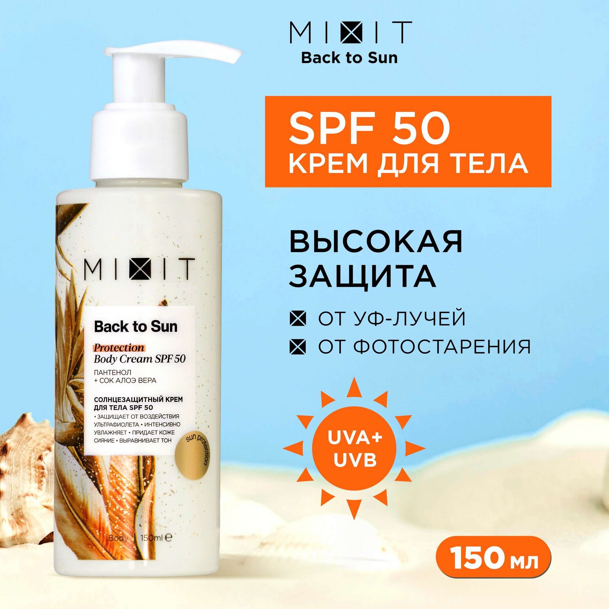 10 цен на Солнцезащитный крем для тела рук и ног MIXIT "BACK TO SUN" увлажняющий SPF 50, с пантенолом и алоэ вера, 150 мл