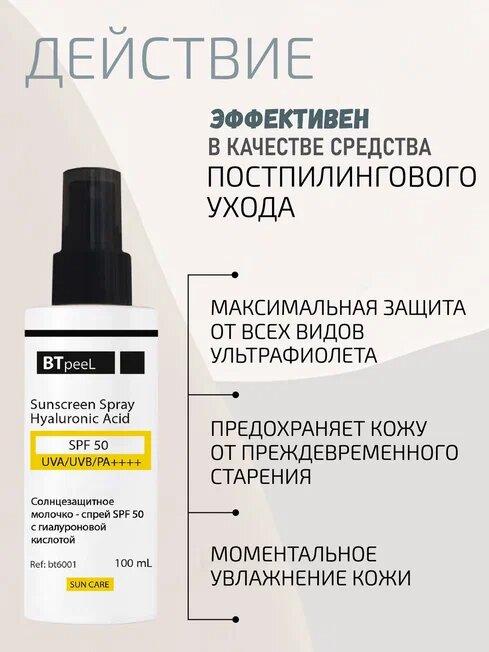 Солнцезащитный cпрей SPF-50 UVA/UVB/PA++++ с гиалуроновой кислотой BTpeel, 100 мл информация: