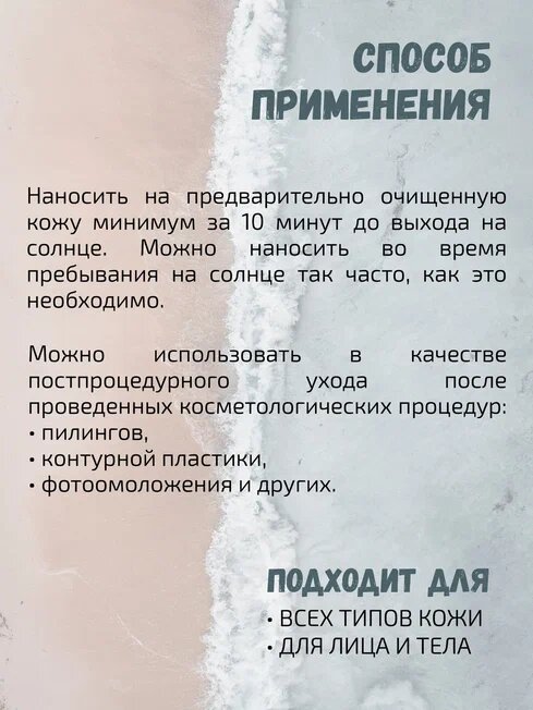 | Способ применения | Наносить на предварительно очищенную кожу минимум за 10 минут до выхода на солнце. Также спрей можно наносить во время пребывания на солнце так часто, как это необходимо. Солнцезащитный cпрей SPF 50 можно использовать в качестве постпроцедурного ухода после проведенных косметологических процедур (пилингов, контурной пластики, фотоомоложения и других). |
