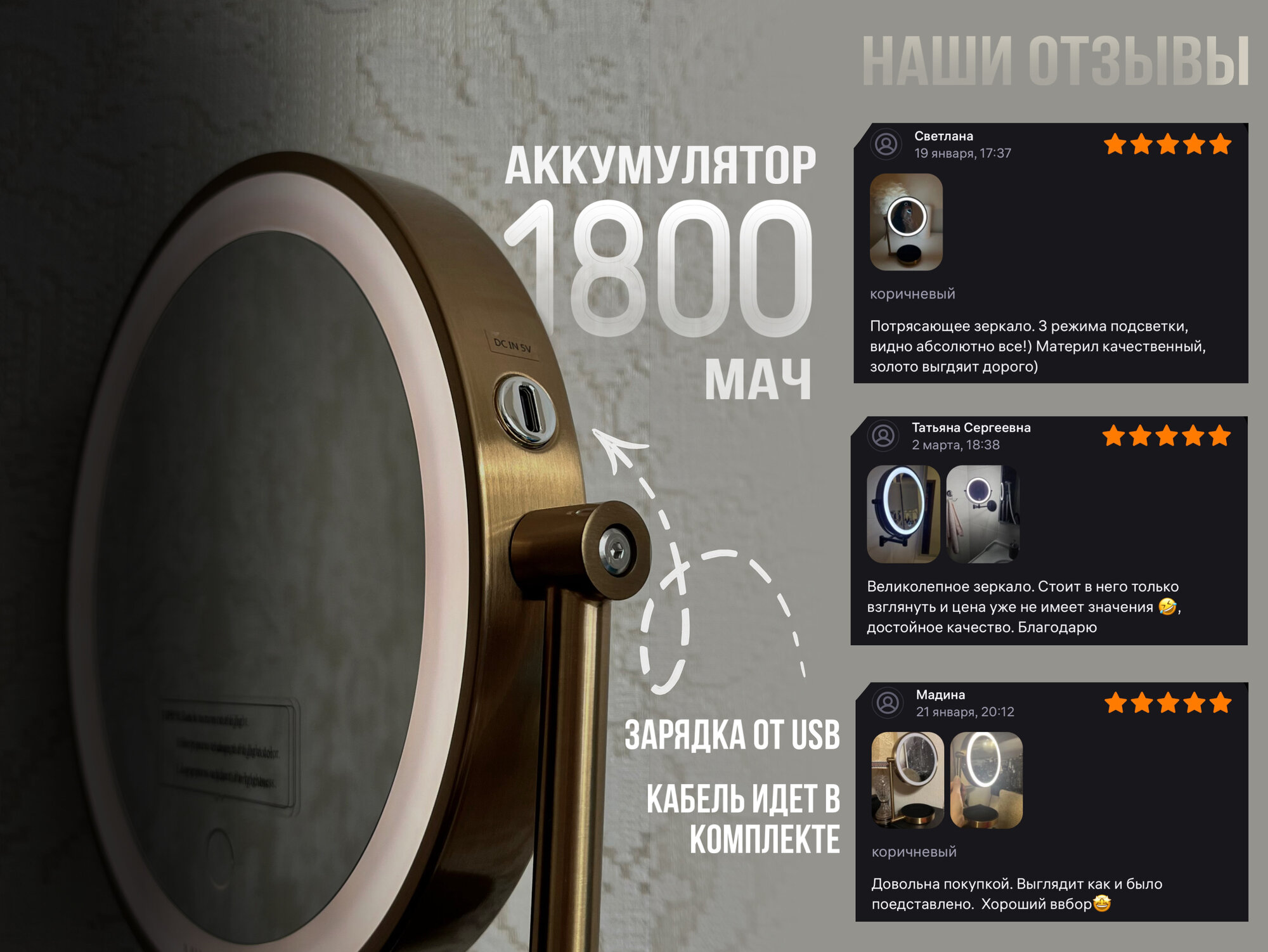 | Комплектация | зеркало, кабель зарядки, инструкция, упаковка |
