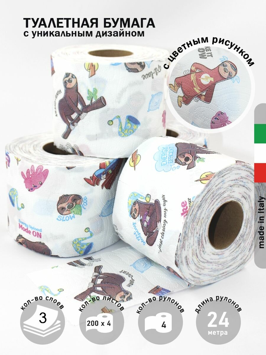 Туалетная бумага с рисунком "Ленивец" 3 слоя, 4 рулона по 200 листов, World Cart информация: