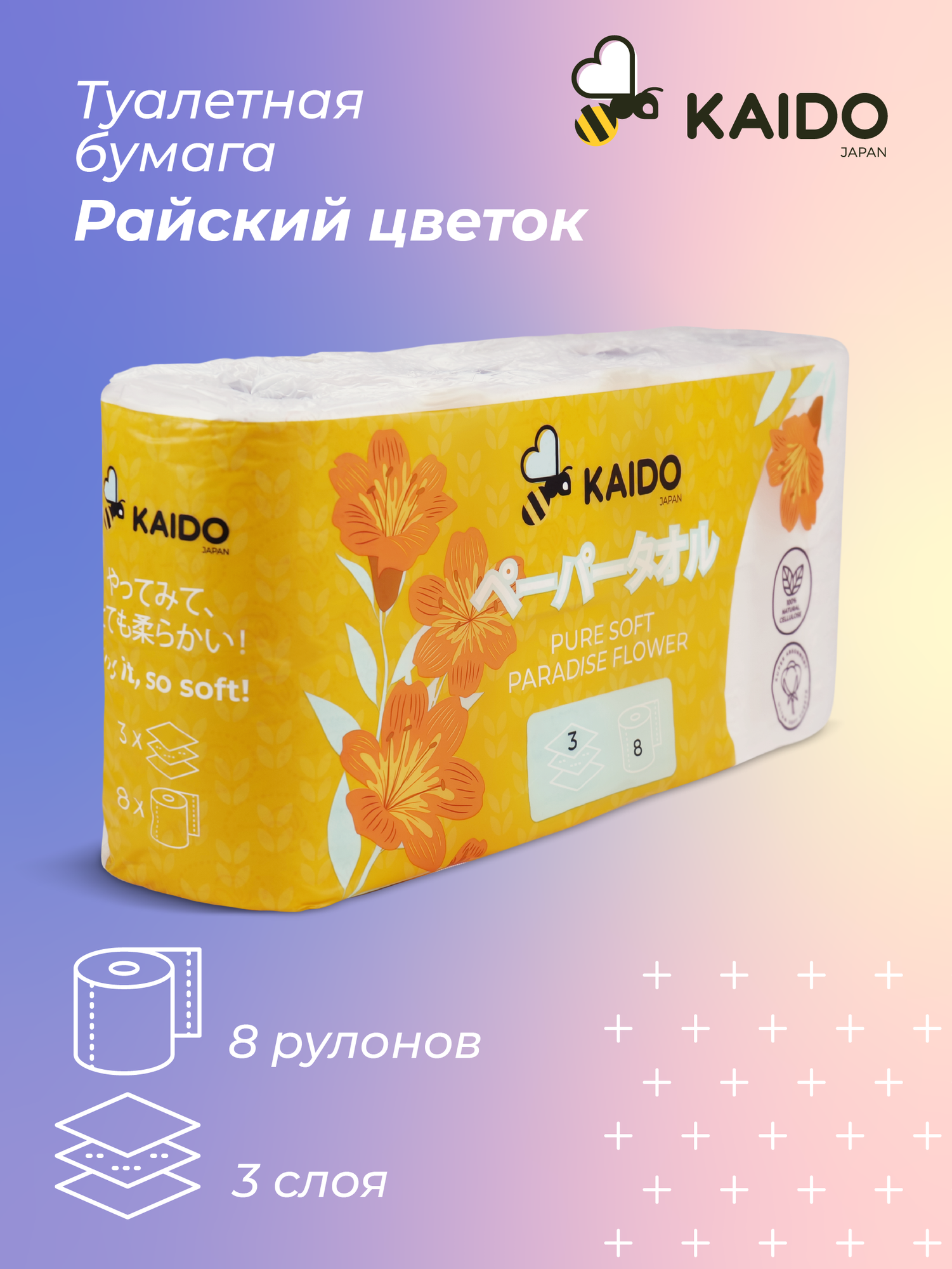 Туалетная бумага KAIDO Райский цветок белая 3 слоя, 8 рулонов информация: