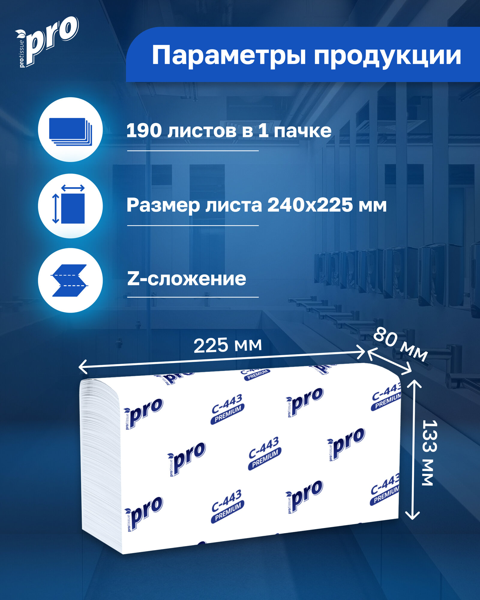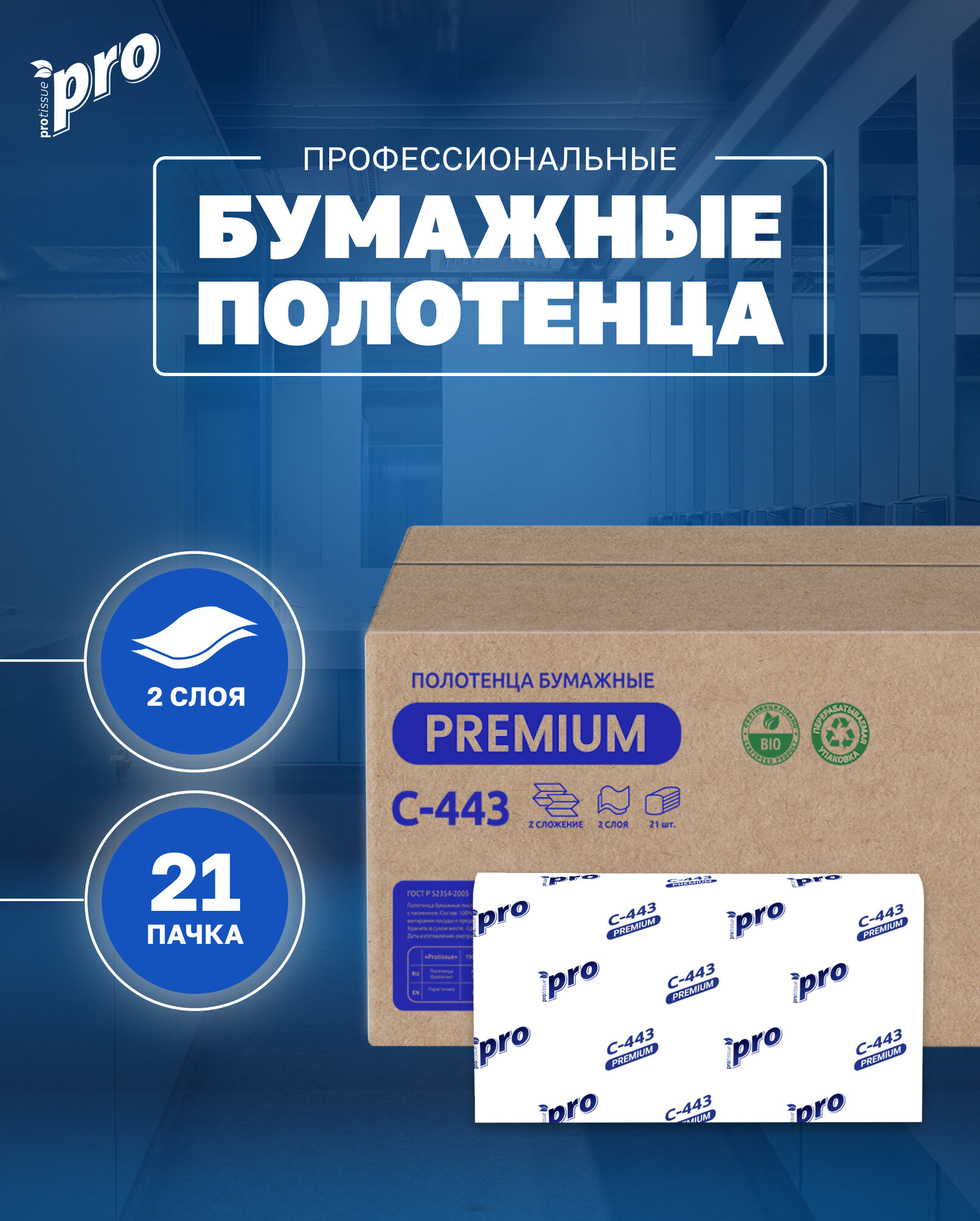 Полотенца бумажные PROTISSUE PREMIUM С443 2-слоя Z-сложения в коробке 21 пачка по 190 листов для диспенсеров информация: