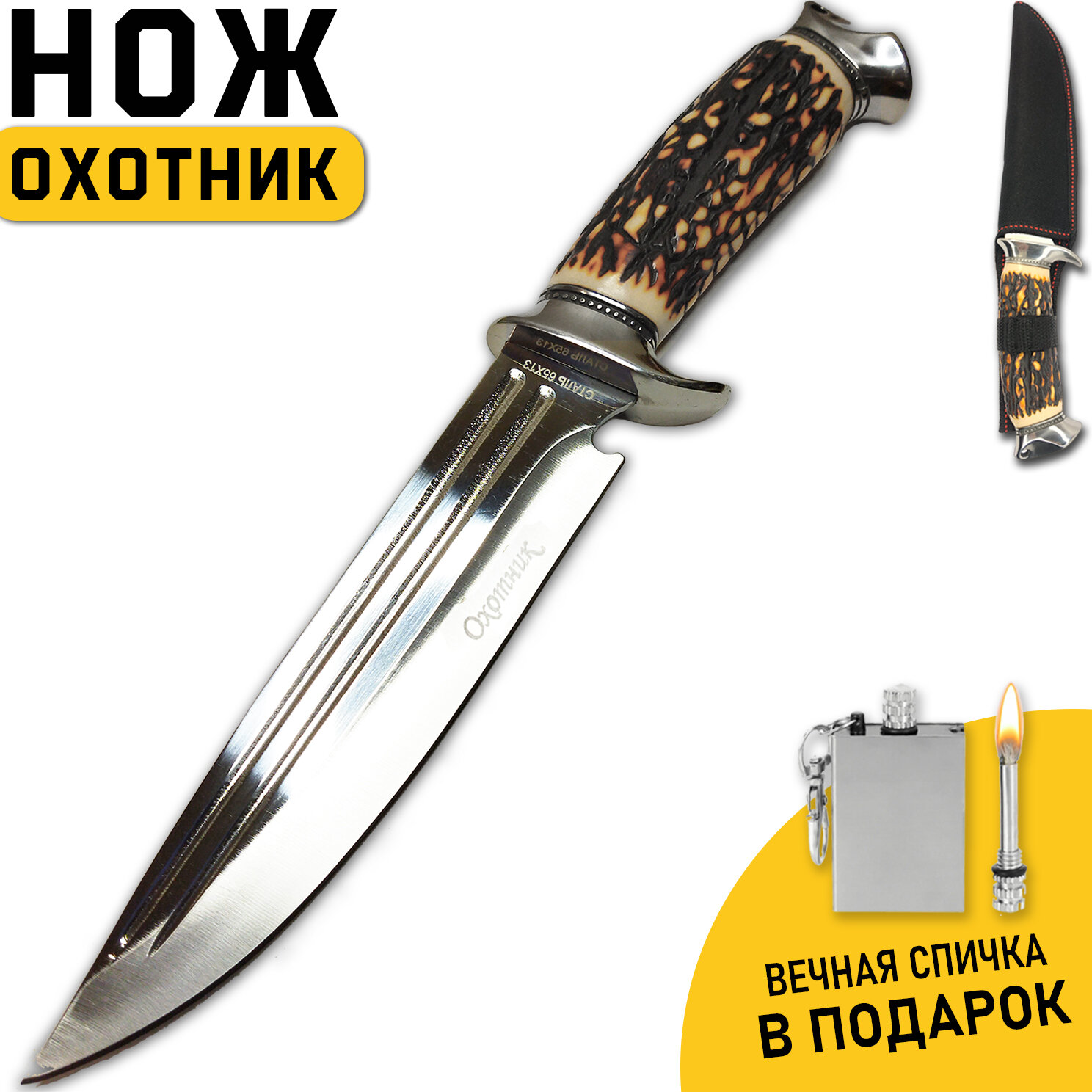 Отзывы на Нож охотничий, туристический, длина клинка 17 см, сталь 65Х13, рукоять под кость / + чехол, спичка