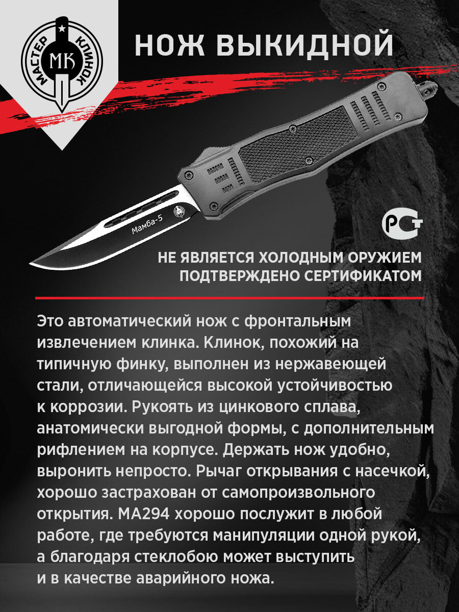 Нож складной Мастер Клинок MA294 (Мамба-5), автомат фронтальный, сталь 420 информация: