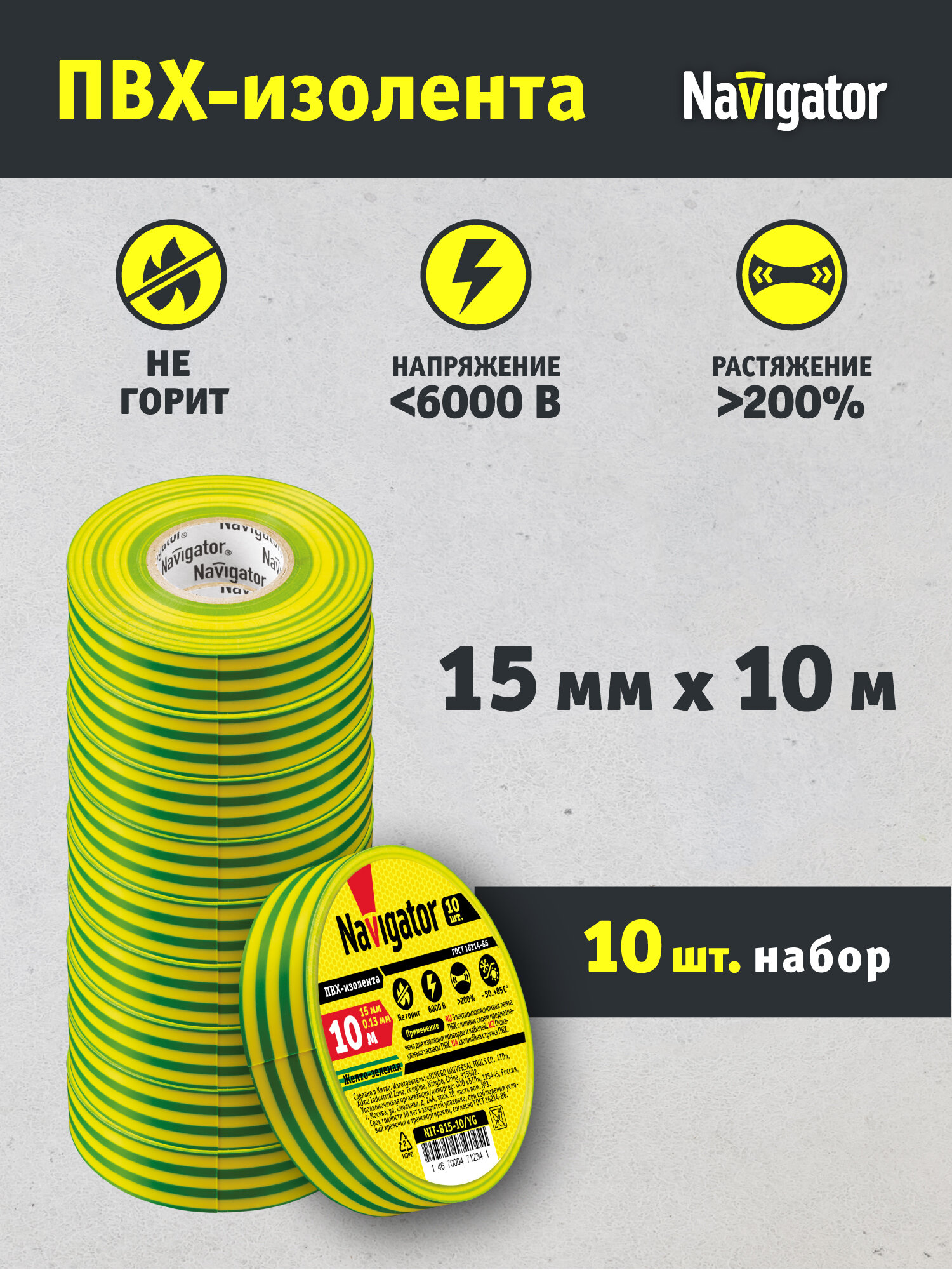 Изолента ПВХ Navigator, жёлто-зелёная 71 234, 15 мм * 10 м, набор 10 шт информация: