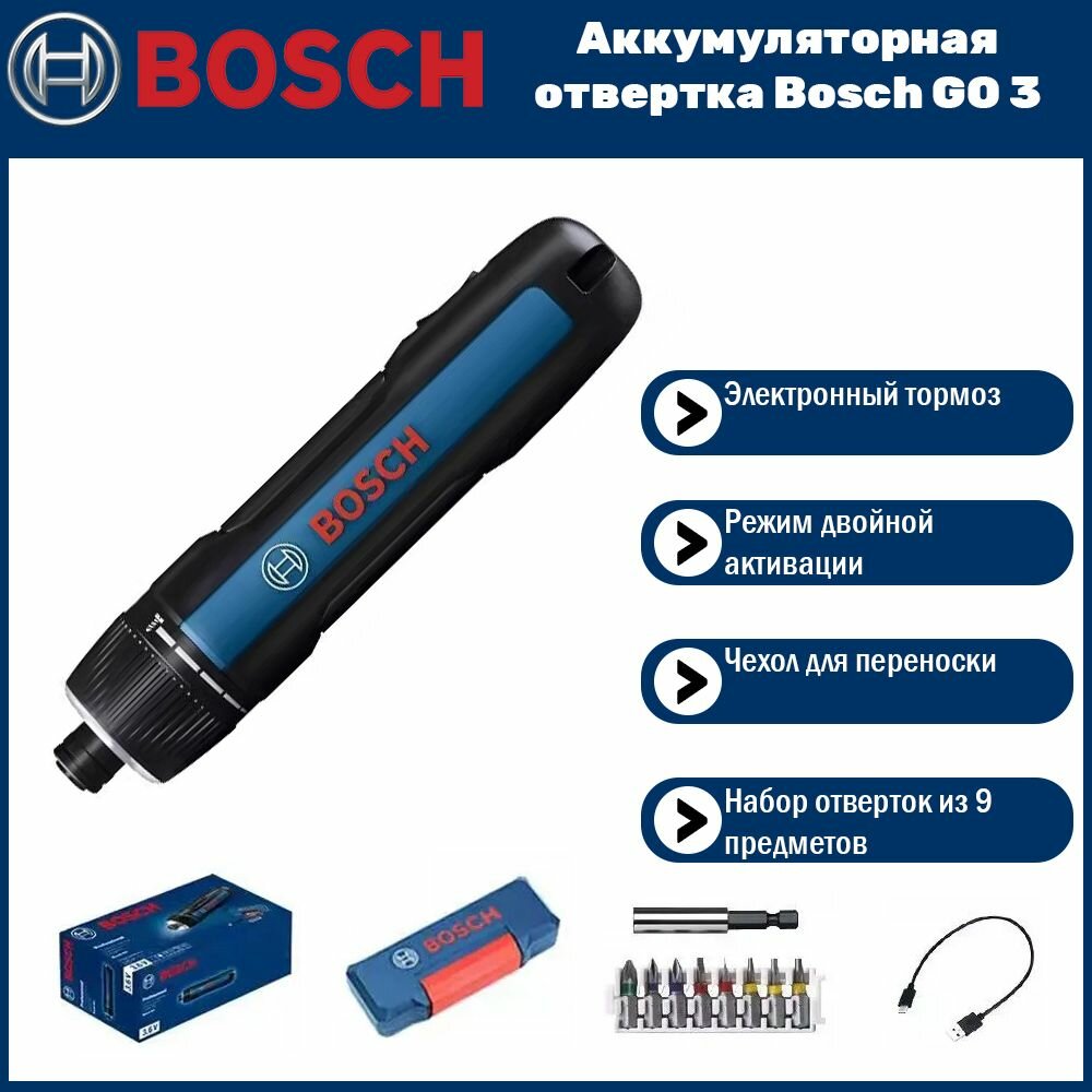 | Комплектация | Аккумуляторная отвертка Bosch GO 3 x1 USB-кабель x1 Набор бит х8 Удлинитель x1 Кейс x1 |