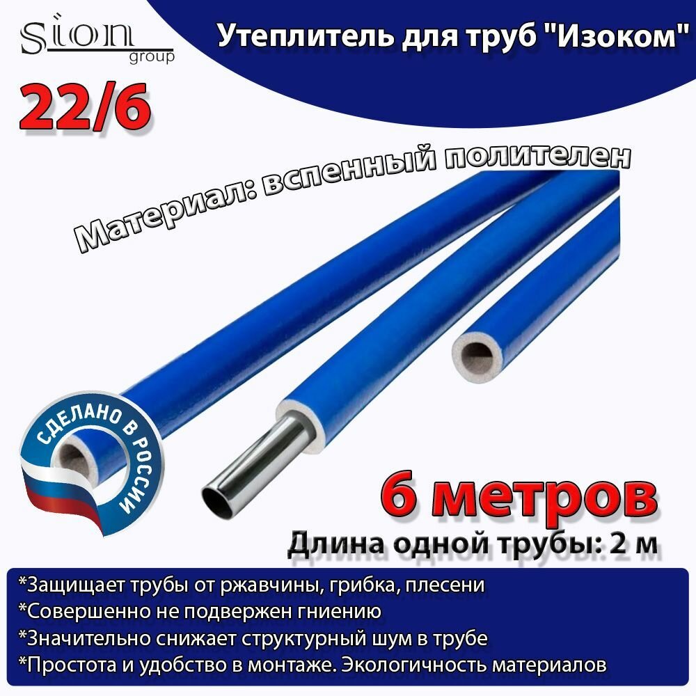 Утеплитель для труб "Изоком" 22/6 синий (по 2 м)-6м/трубка пенополиэтиленовая изоляционная информация: