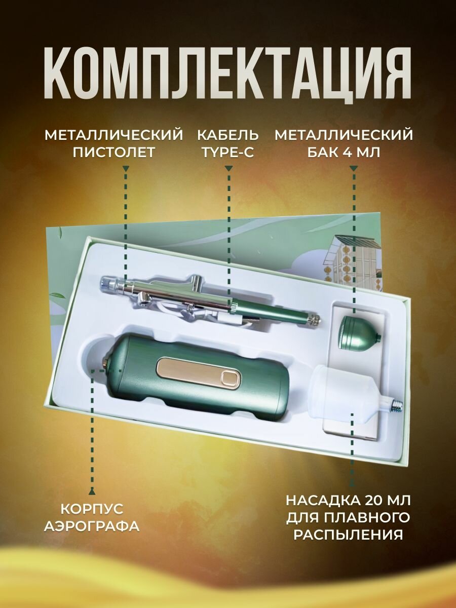 | Комплектация | Аэрограф, Ёмкость 20 мл, Ёмкость 4 мл, Кабель type-c |