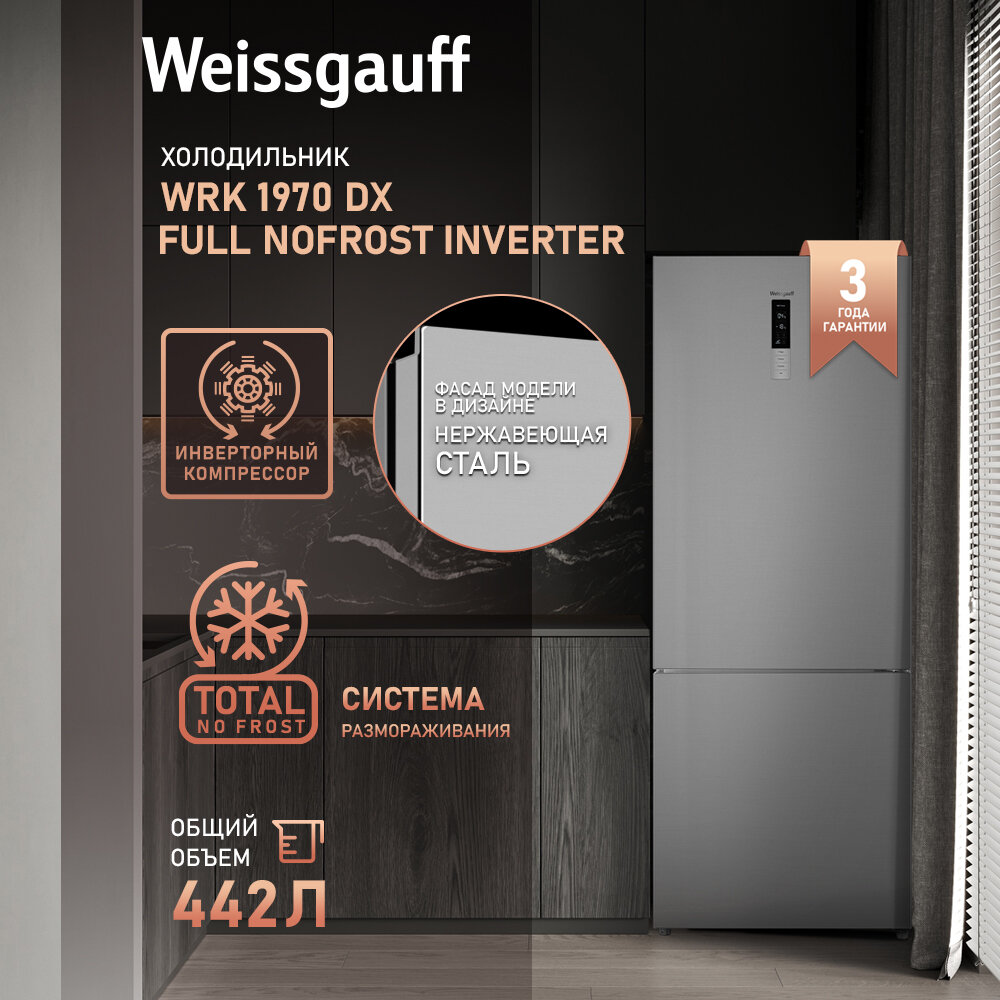 Отдельностоящий холодильник с инвертором Weissgauff WRK 1970 DX Full NoFrost Inverter двухкамерный шириной 70 см, 3 года гарантии, Тихий 39 дБ, высота 185,5, Цифровой дисплей, Сенсорное управление, Супер охлаждение, Супер заморозка, Перенавешиваемая дверь информация:
