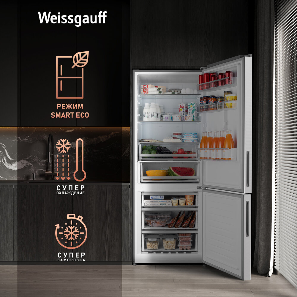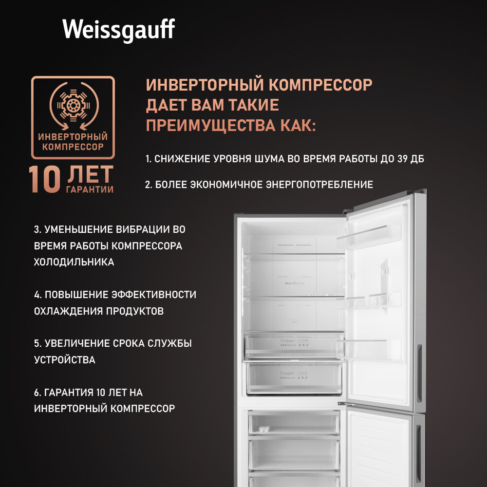 10 цен на Отдельностоящий холодильник с инвертором Weissgauff WRK 1970 DX Full NoFrost Inverter двухкамерный шириной 70 см, 3 года гарантии, Тихий 39 дБ, высота 185,5, Цифровой дисплей, Сенсорное управление, Супер охлаждение, Супер заморозка, Перенавешиваемая дверь