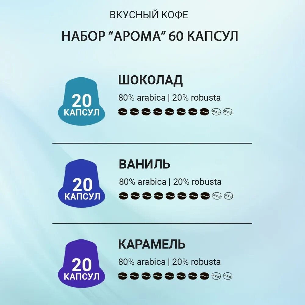 10 цен на Набор Вкусный кофе в капсулах - "Арома" - 3 сорта по 20 шт. Капсулы для кофемашины Nespresso Неспрессо