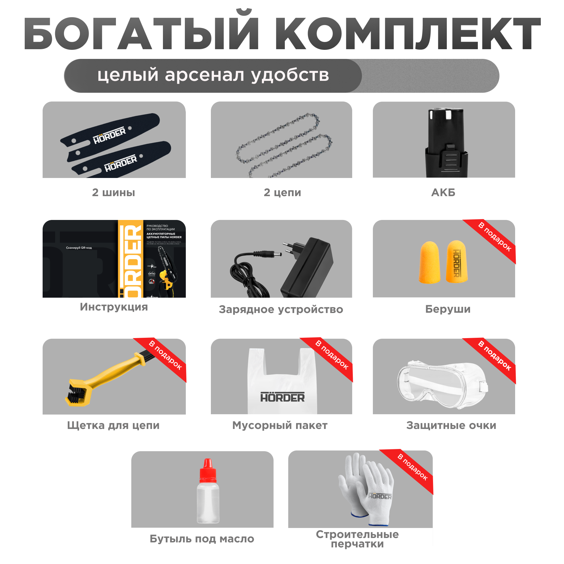 | Комплект поставки | Пила цепная; 2 цепи; 2 шины; аккумулятор; зарядное устройство; перчатки; беруши; защитные очки; строительный карандаш; щетка для чистки цепи |