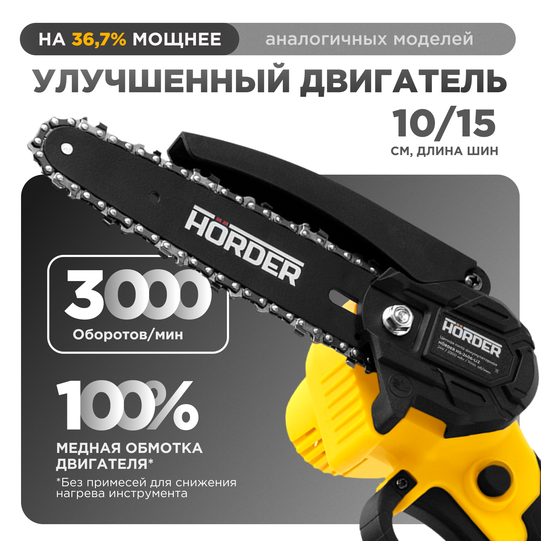 Отзывы на Цепная мини пила HORDER HS-2406 Li2 в кейсе, 2 Li-ion аккумулятора 24 В 2 Ач, 3000 об/мин, 2 шины, 2 цепи 10/15 см