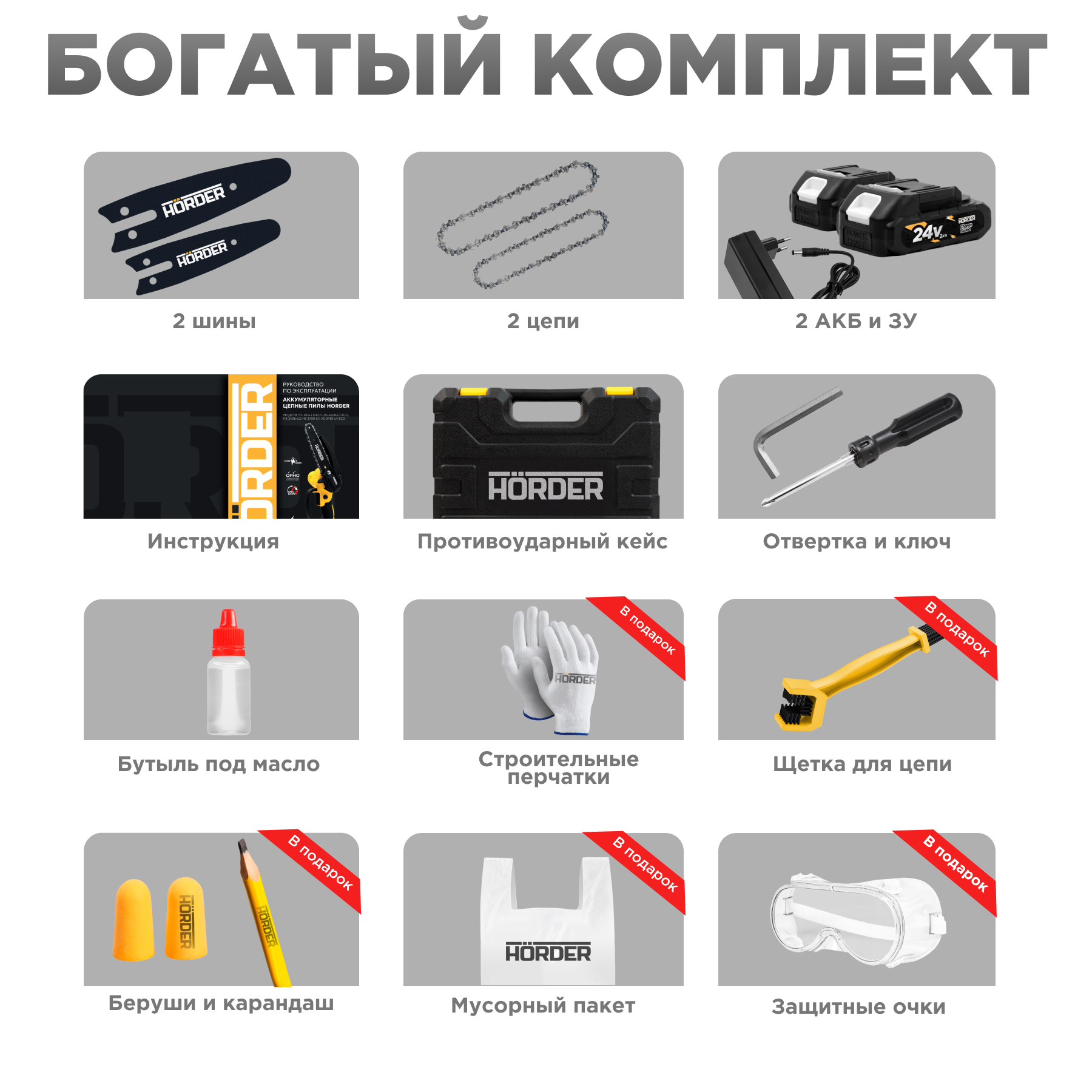 Цепная аккумуляторная мини пила садовая HORDER-HS-2400 Li1 3300 об/мин в кейсе 3 цепи 3 шины, 8"/6"/4", 3000 об/мин бесщеточная, Li-ion аккумулятор 24 В 2 Ач
