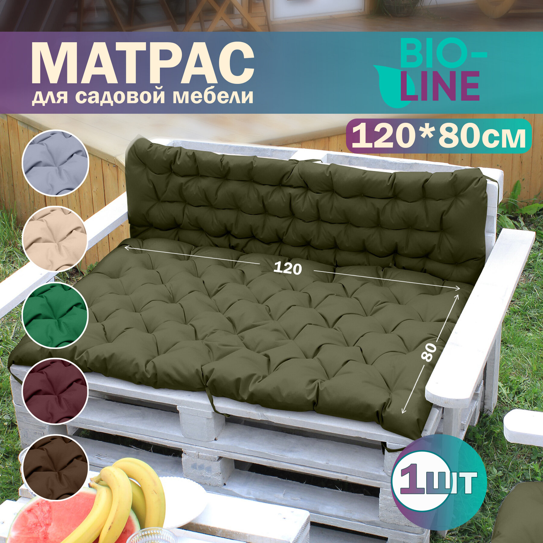 Подушка матрас для мебели и паллет, матрас на подоконник Bio-Line 80х120 см с завязками для дома и дачи с водоотталкивающей пропиткой, хаки информация: