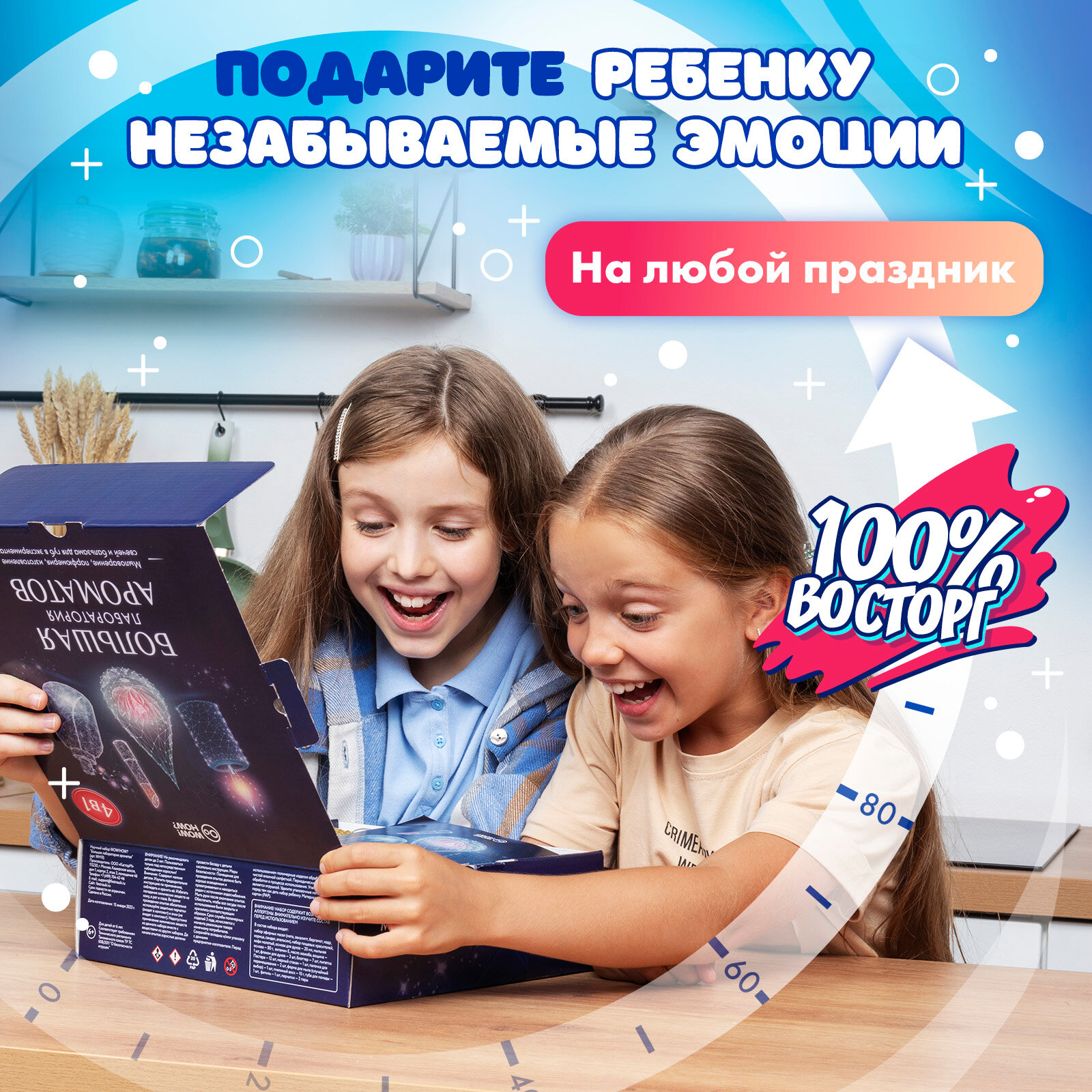 | Состав набора | В набор входит 8 экспериментов: «Мыловарение», «Ароматические свечи», «Духи своими руками», «Гипсовые фигурки», «Бомбочка для ванны», «Разноцветный слайм», «Бальзам для губ», «Мастерская художника». Все необходимые ингредиенты и инструкция уже входят в состав набора. |