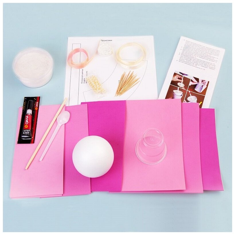 | Состав набора | Пенопластовая заготовка шар 8 см, Разноцветные листы FOM EVA, Клей, Шпажки и зубочистки, Ленты, бусины, кружево, Гипс, Стакан, Ложка, Выкройка, Инструкция с пошаговым описанием и фото. |