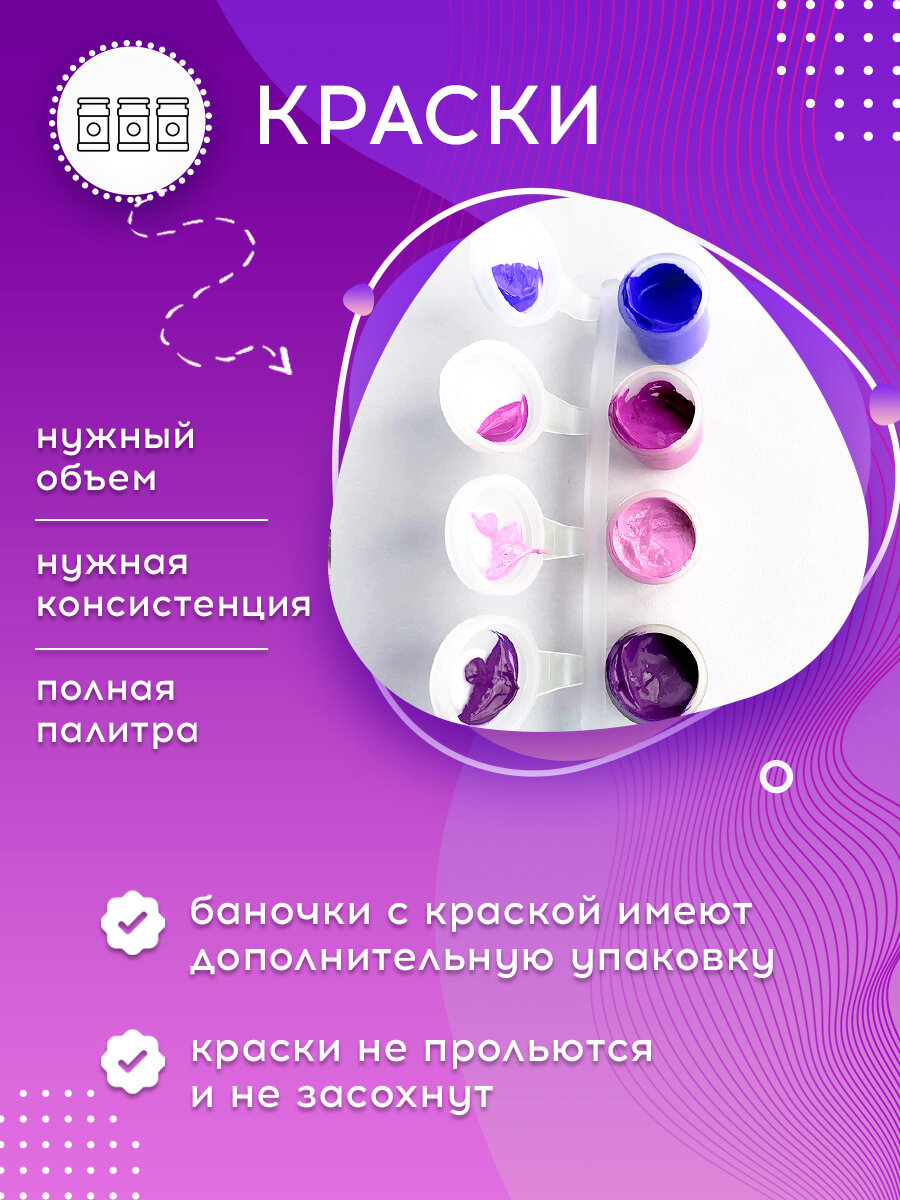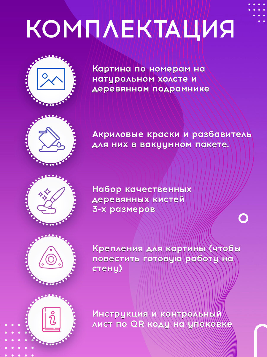 | Комплектация | Кисть (3 шт.);Набор красок;Настенное крепление для картины;Раскраска |