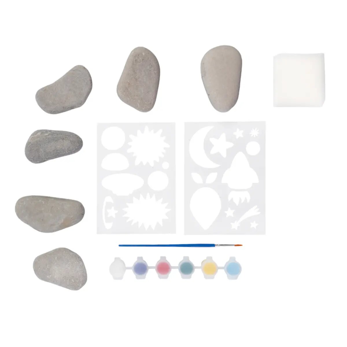 | Подробная комплектация | гладкие камни для росписи - 6 шт. (5х8 см), кисть, акриловые краски - 6 цветов, губка, трафареты - 2 листа (10х15 см) |