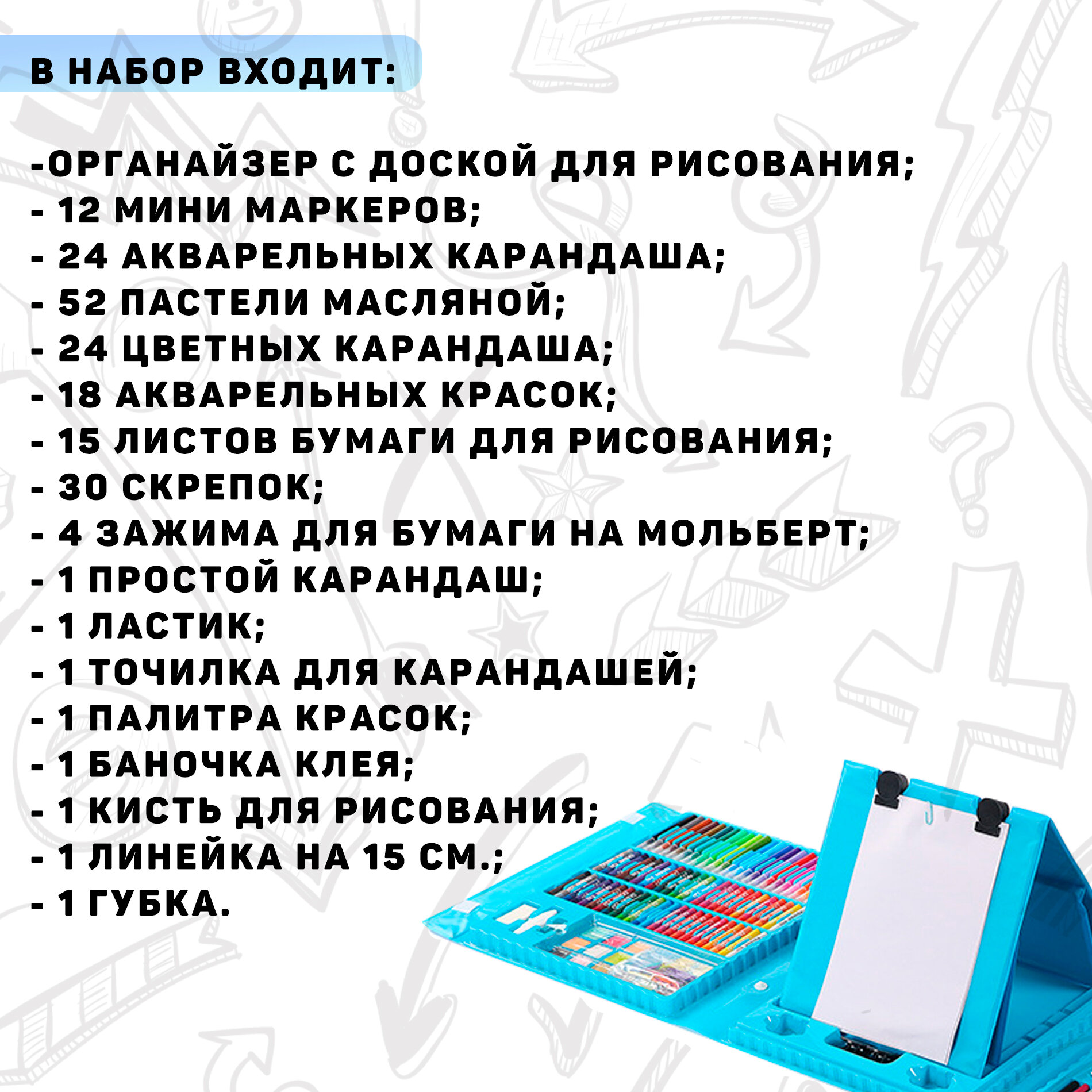 | Состав набора | бумага / карандаши / кисточка / краска / ластик / линейка / маркер / мелки / мольберт / пастель / точилка / штампы |