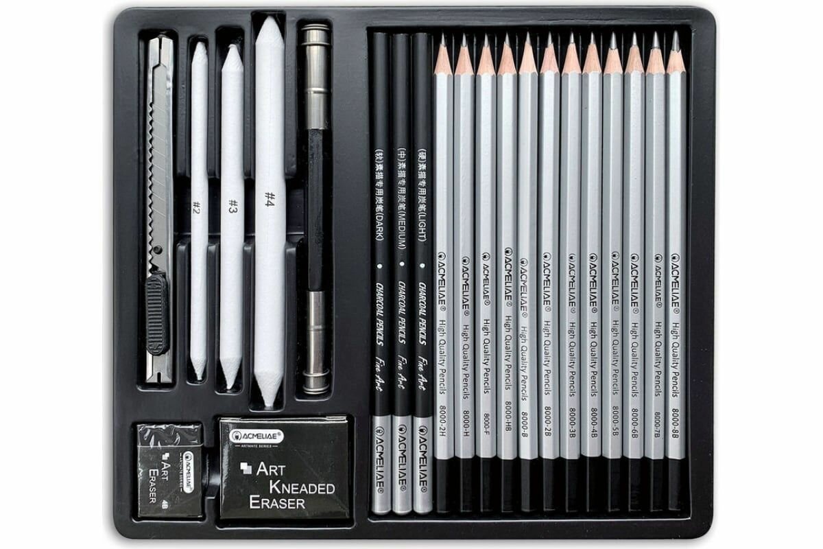 | Комплектация | 2 карандашей твердости 2H,H,F,HB,B,2B,3B,4B,5B,6B,7B,8B 3 угольных карандаша (темный, средний, светлый) 3 растушевки (маленькая, средняя, большая) 1 держатель (удлинитель) для карандашей двусторонний 1 ластик-клячка 1 ластик 1 нож |