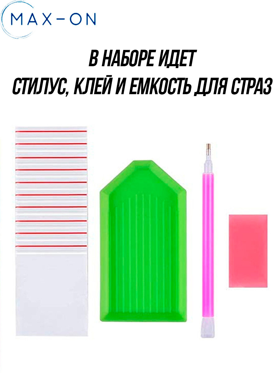 | Комплектация | Холст, набор страз, стилус, клей и емкость для страз |