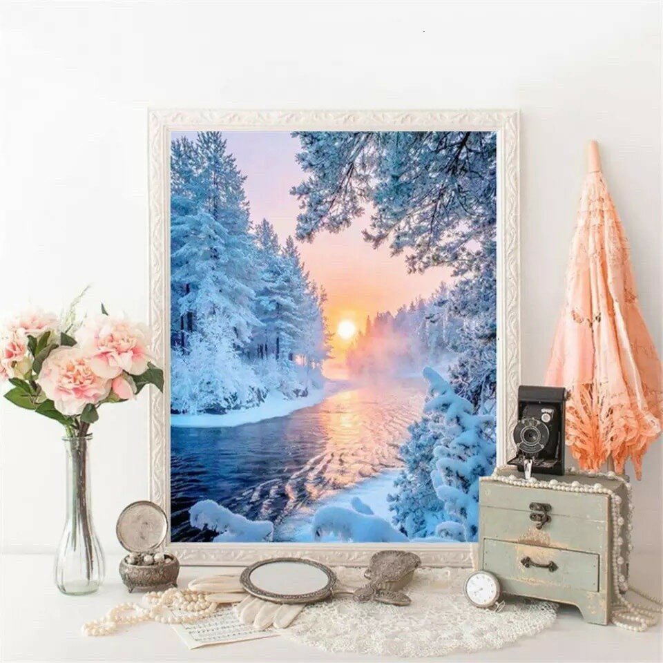 10 цен на Алмазная мозаика 40x50 см. на холсте с подрамником. Закат в зимнем лесу