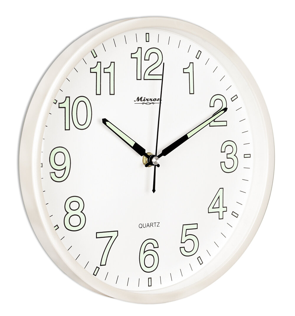 Отзывы на Настенные кварцевые часы MIRRON P2864 ЧБ/Большие круглые часы/26 см/Белый (светлый) циферблат/Светящиеся цифры и стрелки/Белый цвет корпуса/Бесшумные кварцевые часы