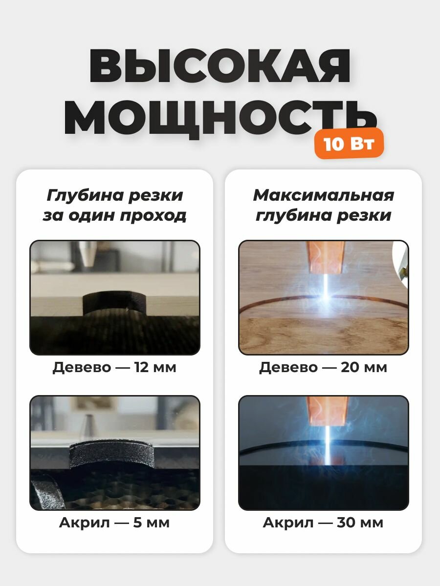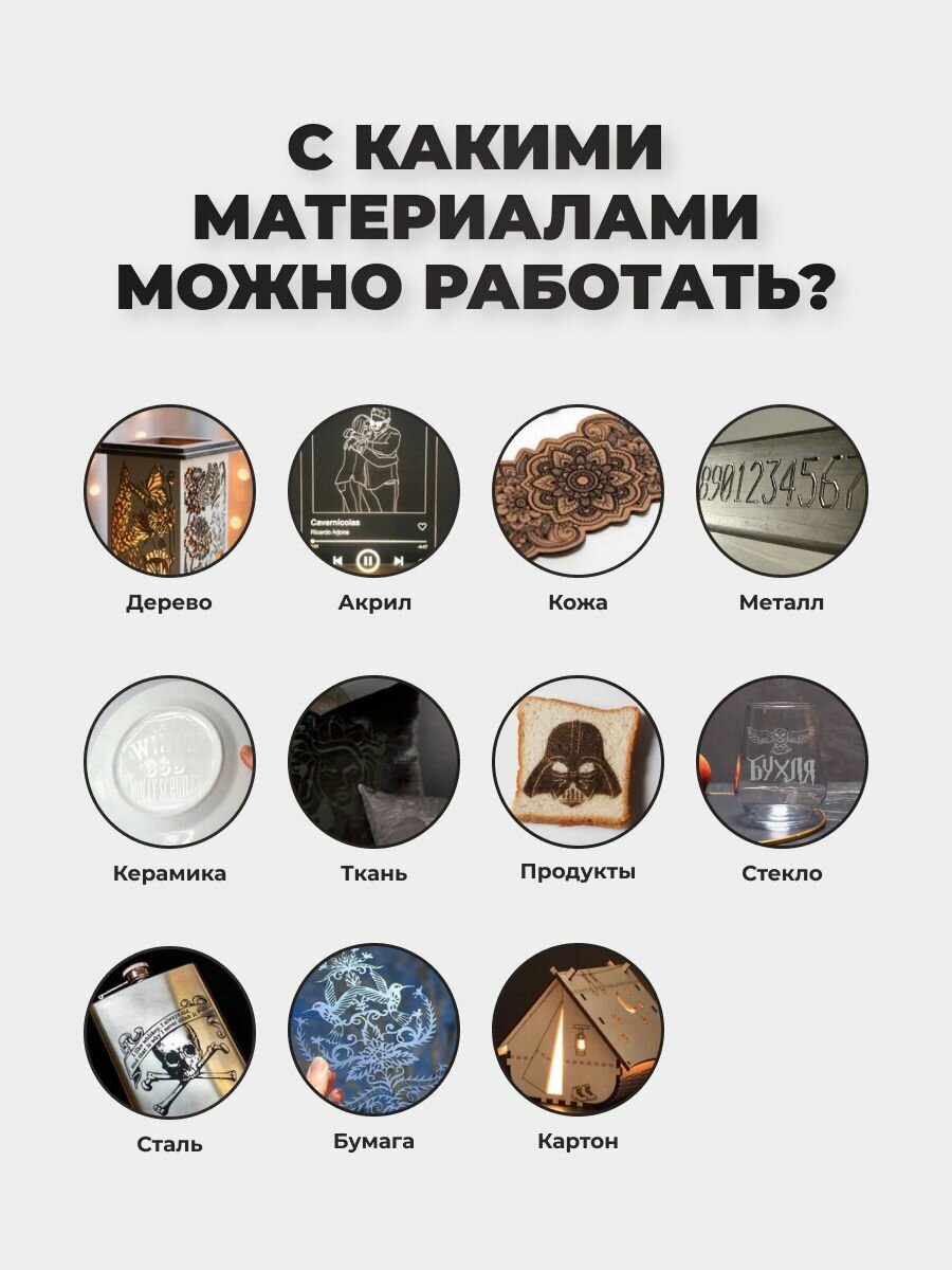| Комплектация | Лазерный модуль с защитной крышкой Пластины для теста из дерева, алюминия и для акрила Лазерный гравер USB-кабель Кисть Ключ гаечный для сборки Кабельные стяжки Защитные очки Шестигранник |