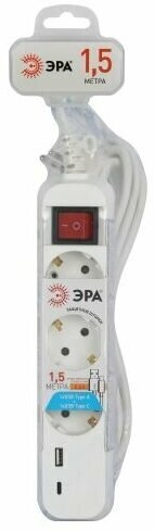 Удлинитель сетевой электрический с заземлением и выключателем ЭРА UB-3es-3m-USB 3 розетки, 1xUSBA+1xUSBC, 3м, 10А информация:
