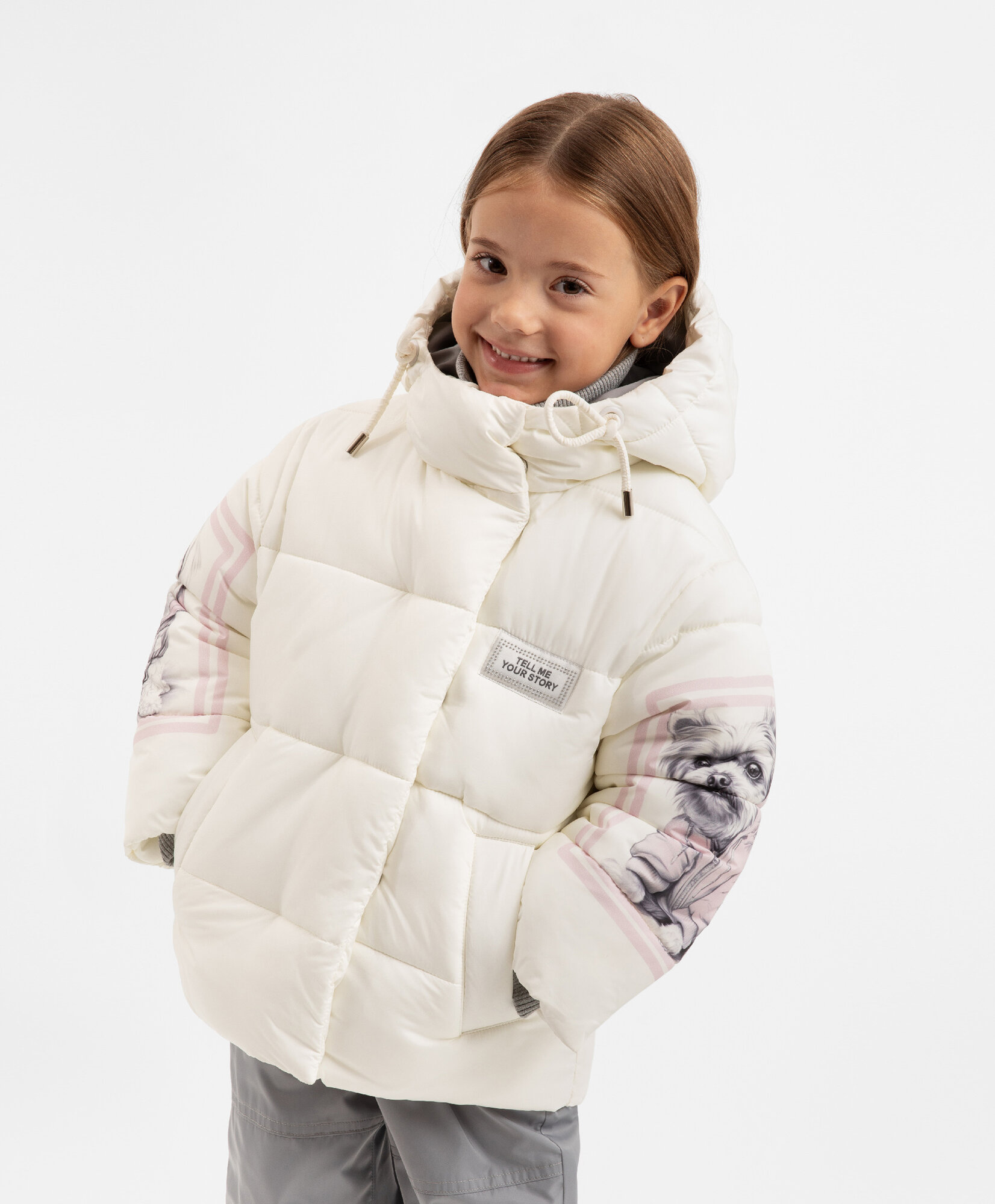 Куртка зимняя на искусственном пуху с принтами и нашивками молочная для девочки Gulliver, р.116, мод.22402GMC4104 информация: