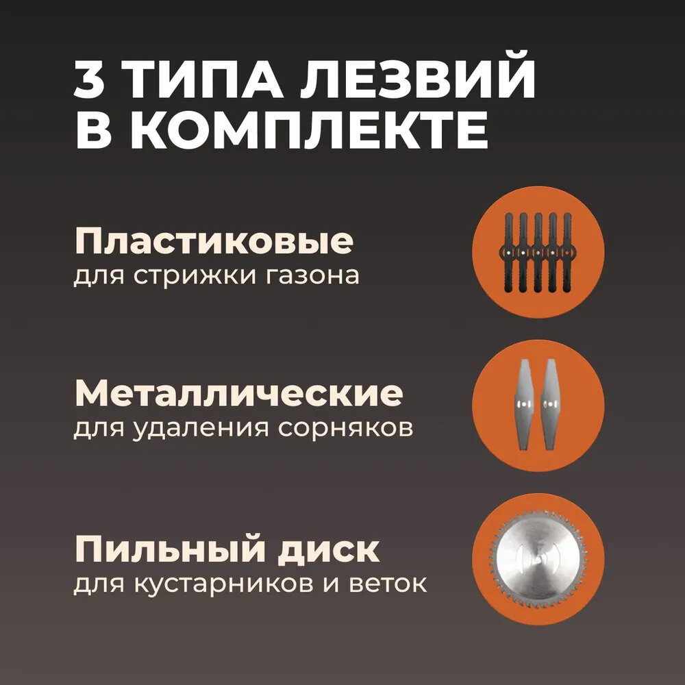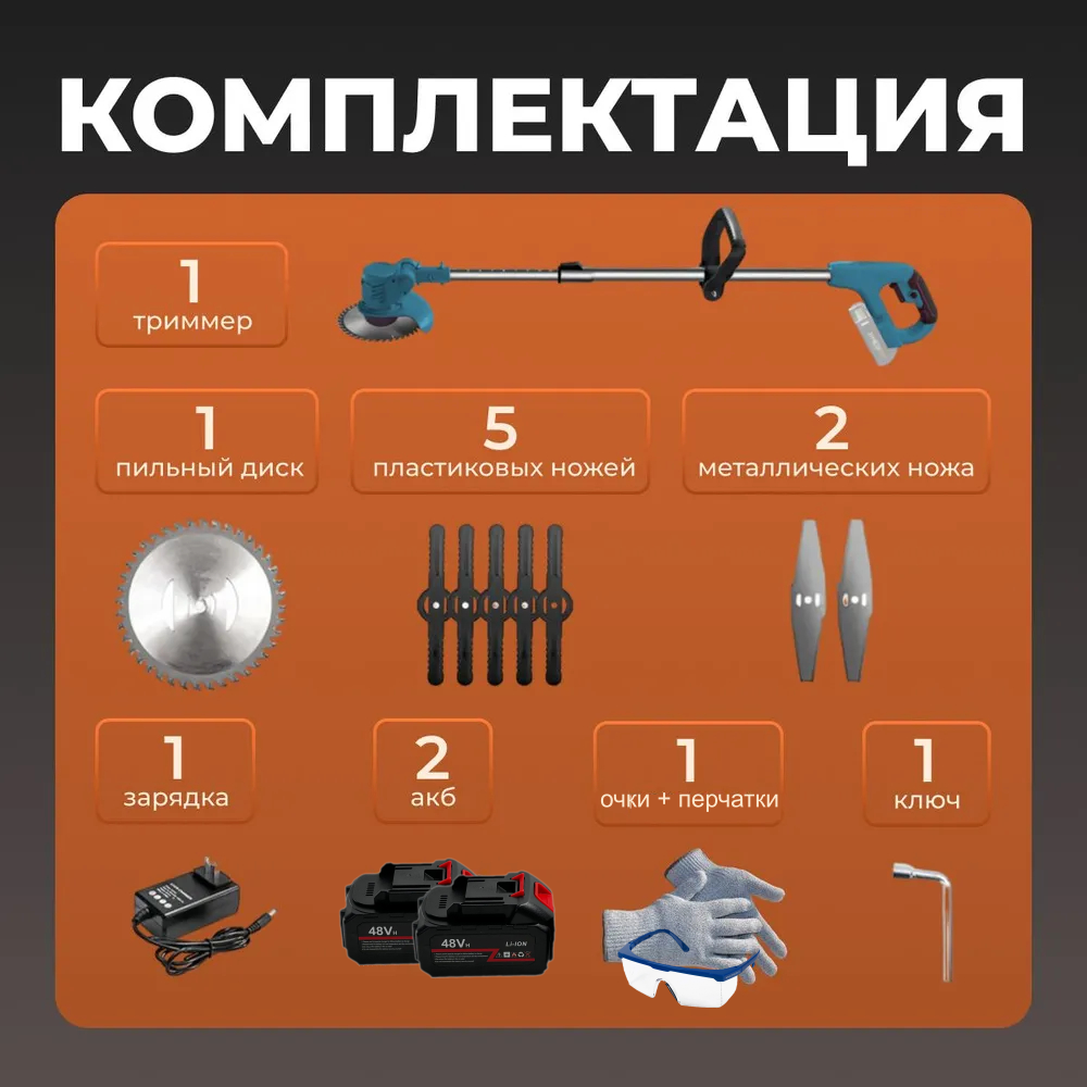 | Подробная комплектация | Триммер - 1 шт; Зарядное устройство - 1 шт; Пильный диск - 1 шт; Пластиковые лезвия - 5 шт; Металлическое лезвие - 2 шт; Шестигранный ключ - 1 шт; Рукоятка - 1 шт; Аккумулятор 48v - 2 шт; Подарок: перчатки - 1 пара, защитные очки - 1 шт. |