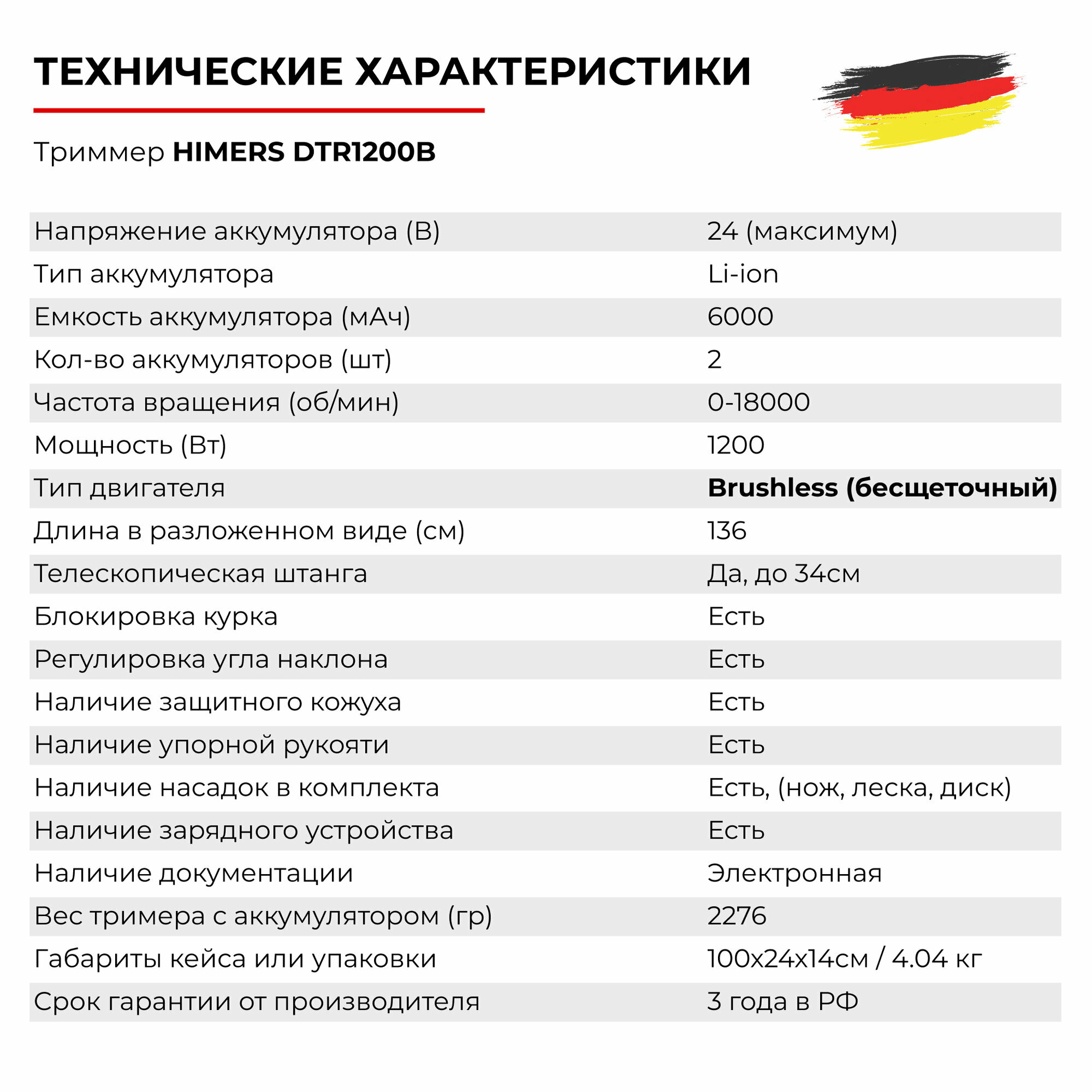 Садовый триммер HIMERS DTR1200B аккумуляторный 24V, 2 АКБ по 6 А.ч, 1200вт, 18000 об/мин / Диск, нож и леска в комплекте информация: