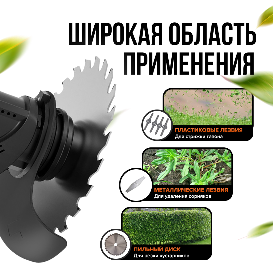 Триммер аккумуляторный для травы Wiekk с 2АКБ черно-оранжевый (перчатки + очки) информация: