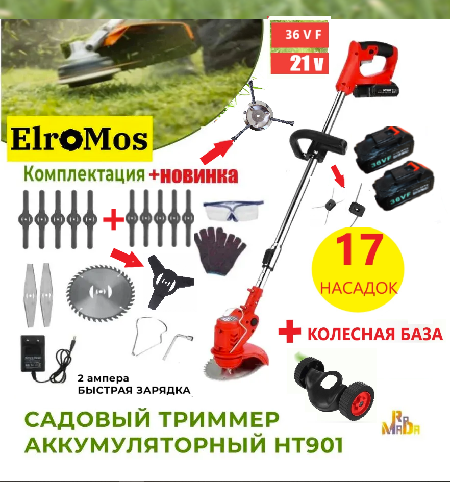 Триммер Садовый аккумуляторный 17 насадок, ElroMos, 21В, 36 VF, 2 АКБ информация: