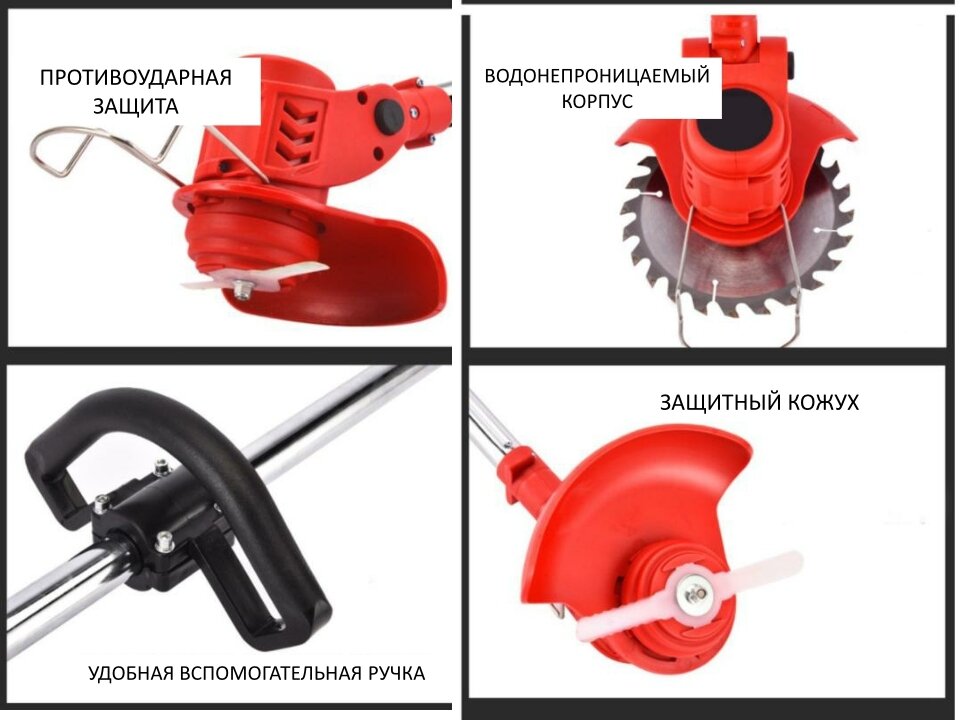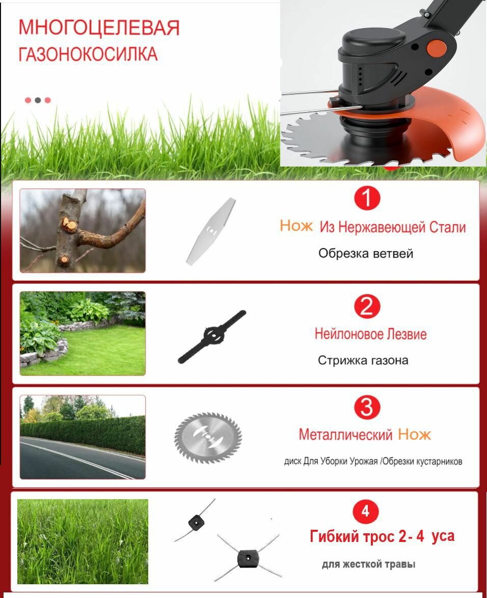 | Подробная комплектация | Триммер; 1 шт. - пильный диск; 2 шт. - металлический нож; 1 шт. - 4-х конечный нож; 10 шт - пластиковый нож; 1 шт.- леска 2 уса; 1 шт.- леска 4 уса; 2 шт - аккумулятор 21 В 36VF. 1 шт - зарядное устройство 2А; ключ; ограничитель; очки; перчатки. Инструкция. |