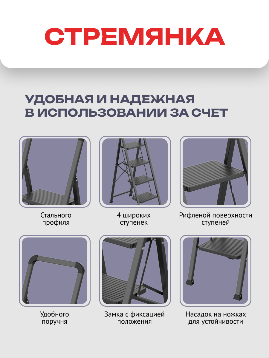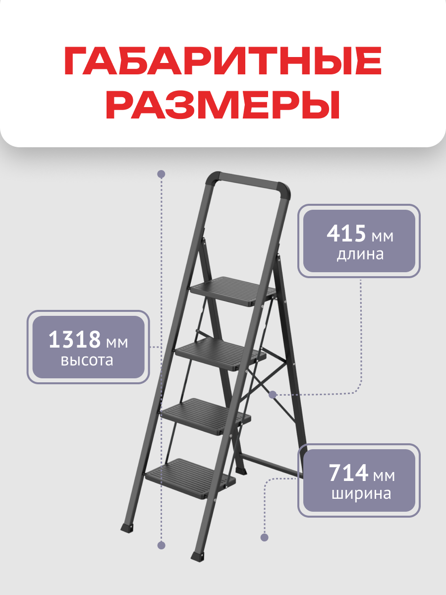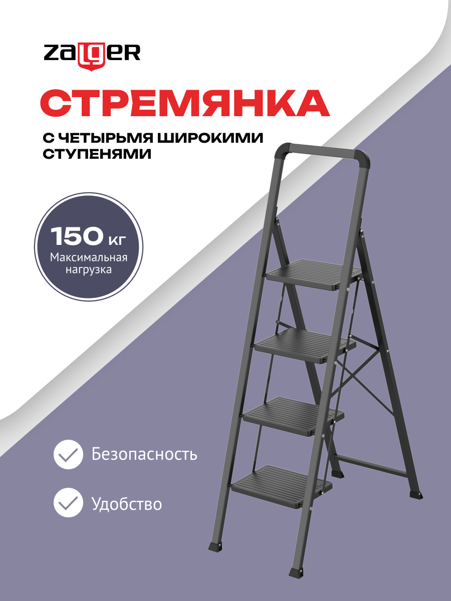 Стремянка стальная Zalger, 4 широкие ступени, черная информация: