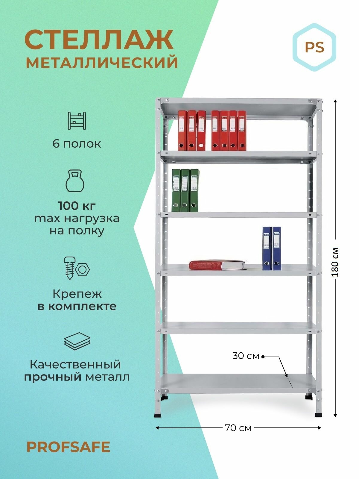 Стеллаж металлический PS 70х30х180 см, 6 полок, серый. Модульный Универсальный Напольный информация: