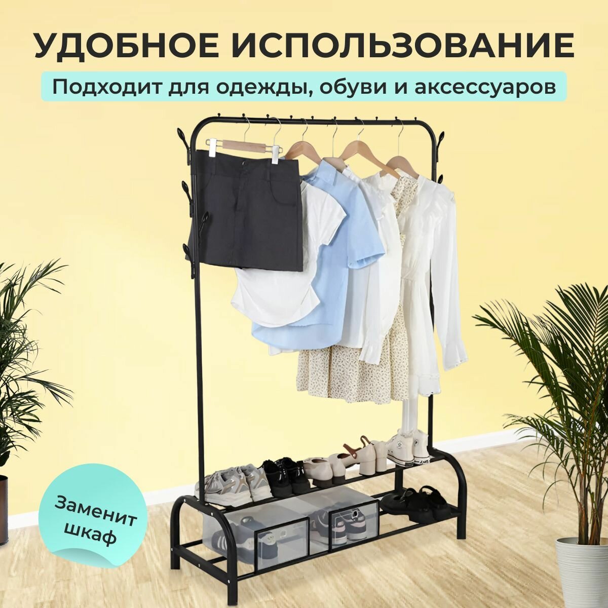 10 цен на Вешалка напольная для одежды, Вешалка напольная рейл, 157x110x40 см, с обувницей